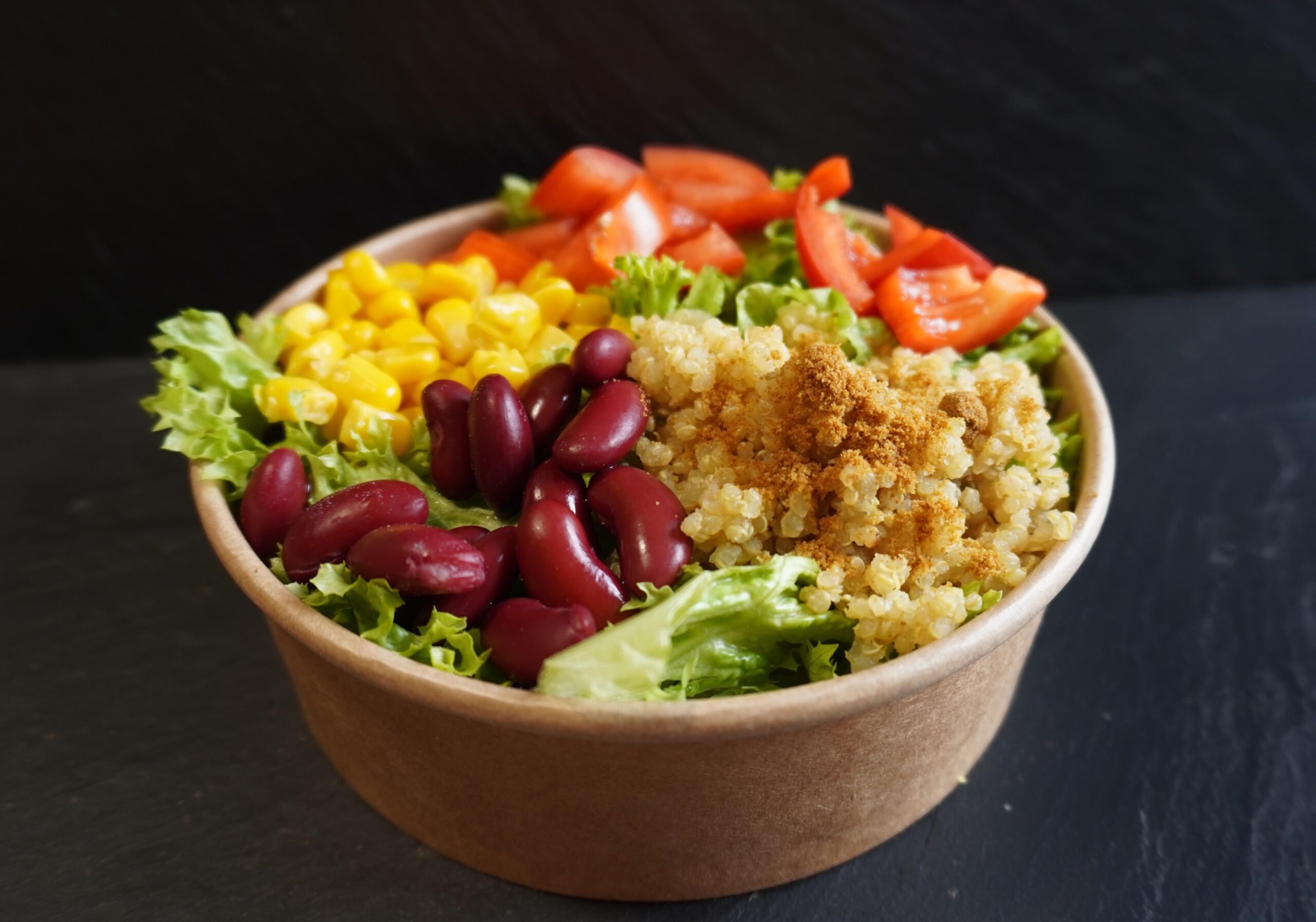 | Zutaten | Lolosalat, Mais, Peperoni, Tomate, Bohnen, Quinoa |